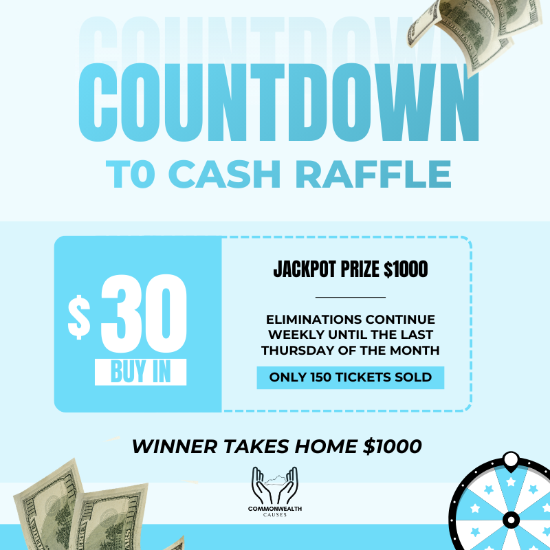 The Countdown to Cash is a raffle where the winner is chosen by eliminating tickets over time instead of drawing one winner right away, made by Commonwealth Causes, a Kentucky based 501(c)(3) nonprofit organization, gaming license #ORG0002761.
